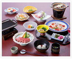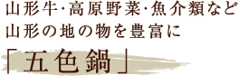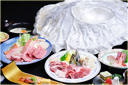 食材は、山形牛・高原野菜・魚介類など山形の地の物を豊富に盛り込んでおります。お鍋の形を利用して、山肌ではバーベキュー、噴火口ではしゃぶしゃぶと2種類の方法で調理します。