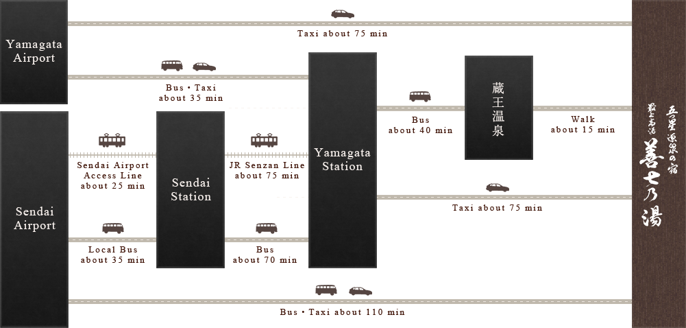 자오 온천 지역은 호텔 전용 셔틀 버스를 이용해 주십시오. (자오 버스터미널, 로프웨이, 온천거리의 식당과 선술집 등) 겨울철(12월∼3월)에는 스키장까지 픽업시간이 정해져 있습니다. 프런트에서 확인해 주십시오. JR 야마가타 역·JR 가미노야마온센 역까지의 교통편은 사전 예약이 필요합니다. 경우에 따라 픽업하지 못할 수도 있으므로 양해하여 주십시오.