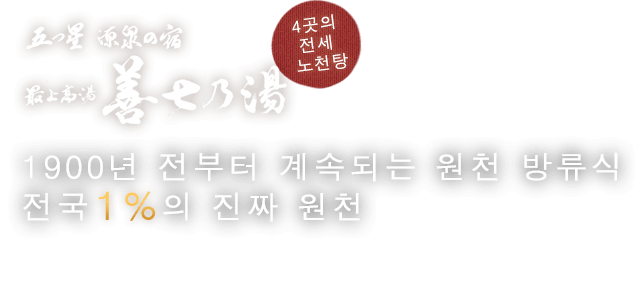 오히라 호텔의 온천은 1900년 전부터 계속되는 유백색 강산성 온천수의 100% 원천 방류식 온천입니다. 전국의 약 14,000곳의 온천 여관 중에 100% 원천 방류식은 단 1%밖에 없습니다. 보다 신선한 온천수를 즐겨 보십시오.