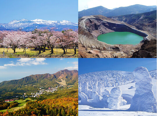 能遇見剛剛甦醒的植物與動物們的春天。夜空被無數繁星的光芒所填滿的夏天。 以深山中多彩的紅葉與香氣所彩繪而成的秋天。由樹冰和夢幻的銀白世界所交織的冬天。 有四季變換的美麗及壯闊有力的瞭望美景。以及順應著季節所上演的精彩活動。敬請蒞臨藏王,用五感親身感受大自然的氣息。